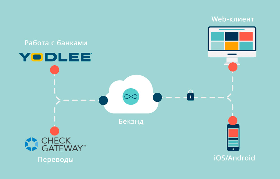 Бекэнд также отвечает за связь с банками и переводами, клиентская часть в соединении с банками не участвует;